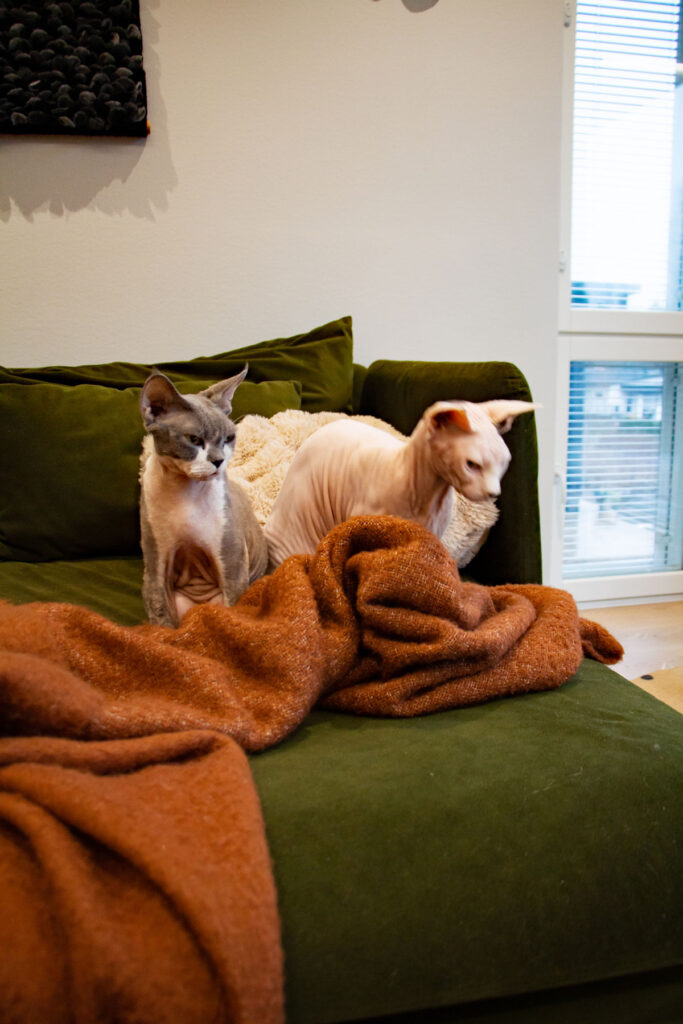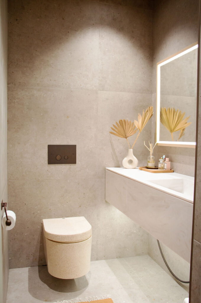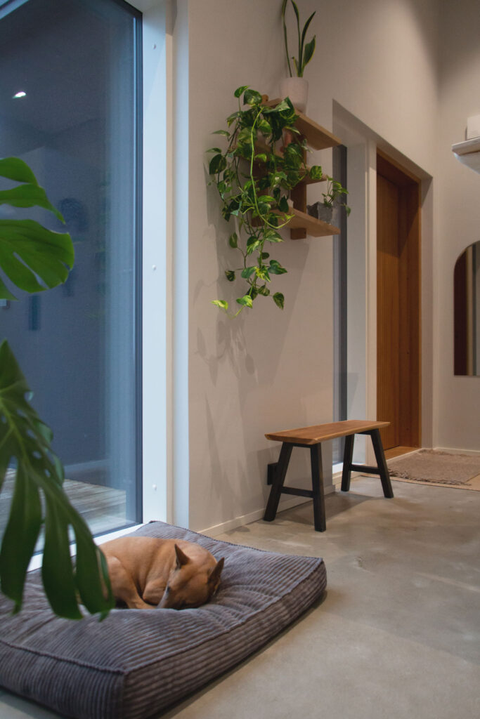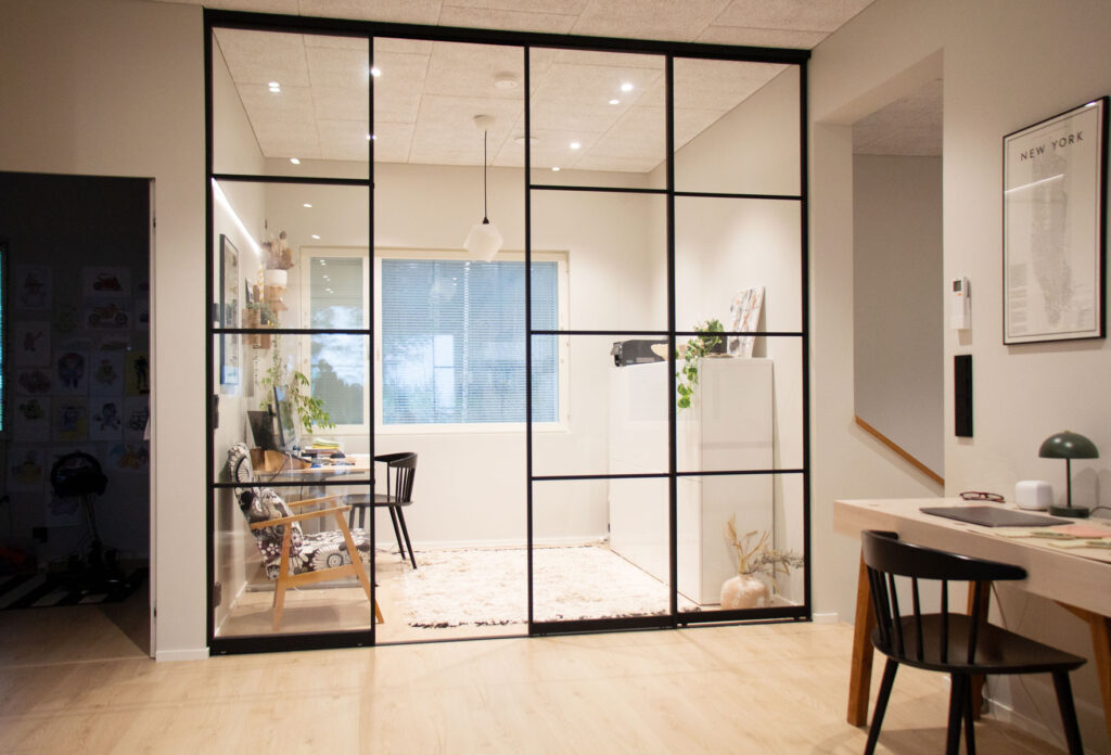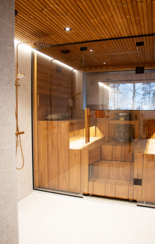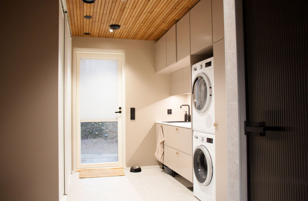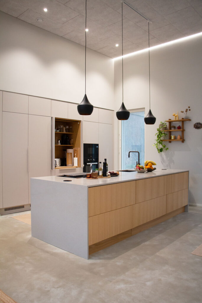 Perhe panosti paljon materiaalivalintoihin. Osa laatoista tilattiin Italiasta asti, ovet taas suoraan valmistajalta – ja nämä omat hankinnat toivat huomattavia säästöjä. Lattiapinnaksi valittiin hiottu betoni, joka osoittautui nappivalinnaksi: pehmeän tuntuinen, lämmin jalkojen alla ja kaukana luistinradasta. Harkinta ja materiaaleihin tutustuminen siis kannatti.
