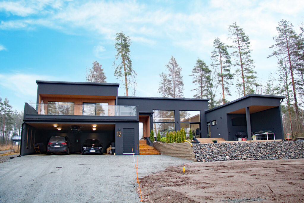 Tontti oli tasainen, ei mikään klassinen rinnetontti, mutta kivitalo tuntui silti oikealta ratkaisulta. Aikaisemmat kokemukset rakentamisesta antoivat varmuutta kilpailutukseen, ja oikean urakoitsijan valinta osoittautui jälleen yhdeksi projektin tärkeimmistä palasista. Lakan toimitussisältö oli laaja ja joustava – esimerkiksi ikkunat päätettiin kilpailuttaa erikseen, mikä antoi tunteen siitä, että oma visio pysyi hyvin ohjaksissa.